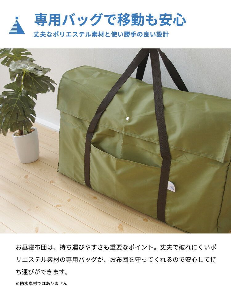 丈夫で破れにくいポリエステル素材の専用バッグが、お布団を守ってくれるので安心して持ち運びができます。
